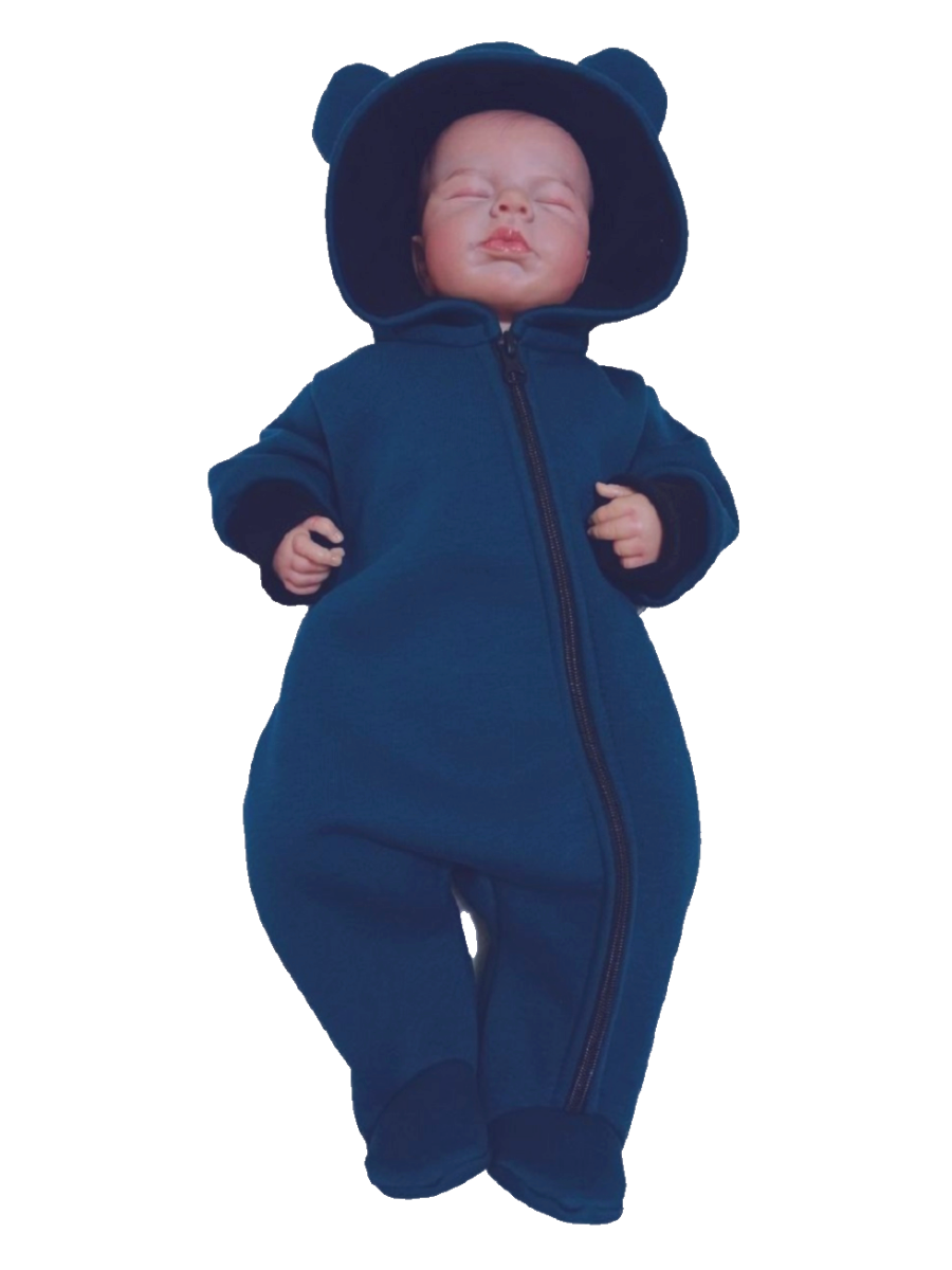 Комбинезон с закрытыми ножками, с капюшоном на подкладке, на молнии по всей длине и до конца одной ножки.