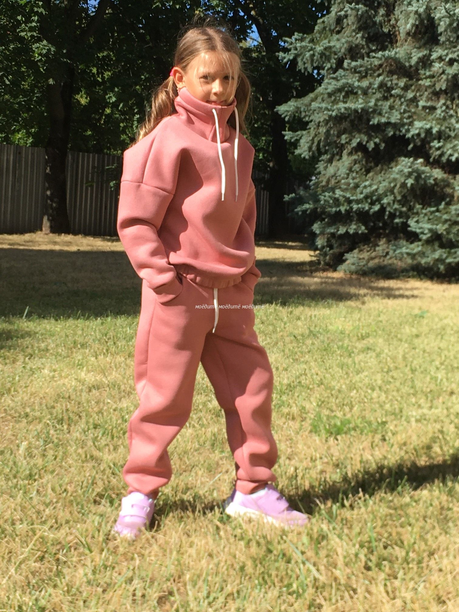 Костюм выполнен из футера 3-хнитки с начёсом. Состоит из свитшота и брюк. Брюки сверху на широкой резинке и со шнурком, снизу на манжете с отворотом. Свитшот с воротником-стойкой, украшен шнурком, снизу вставлена резинка, рукава на манжетах с отворотом.