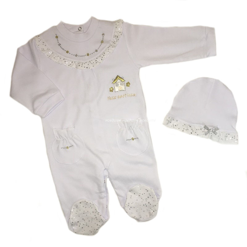 Комплект состоит из 100% хлопка, комбинезон с закрытыми ножками, с кнопочками сзади по все длине спинки и между ножек, шапочка-панамка без завязок.
